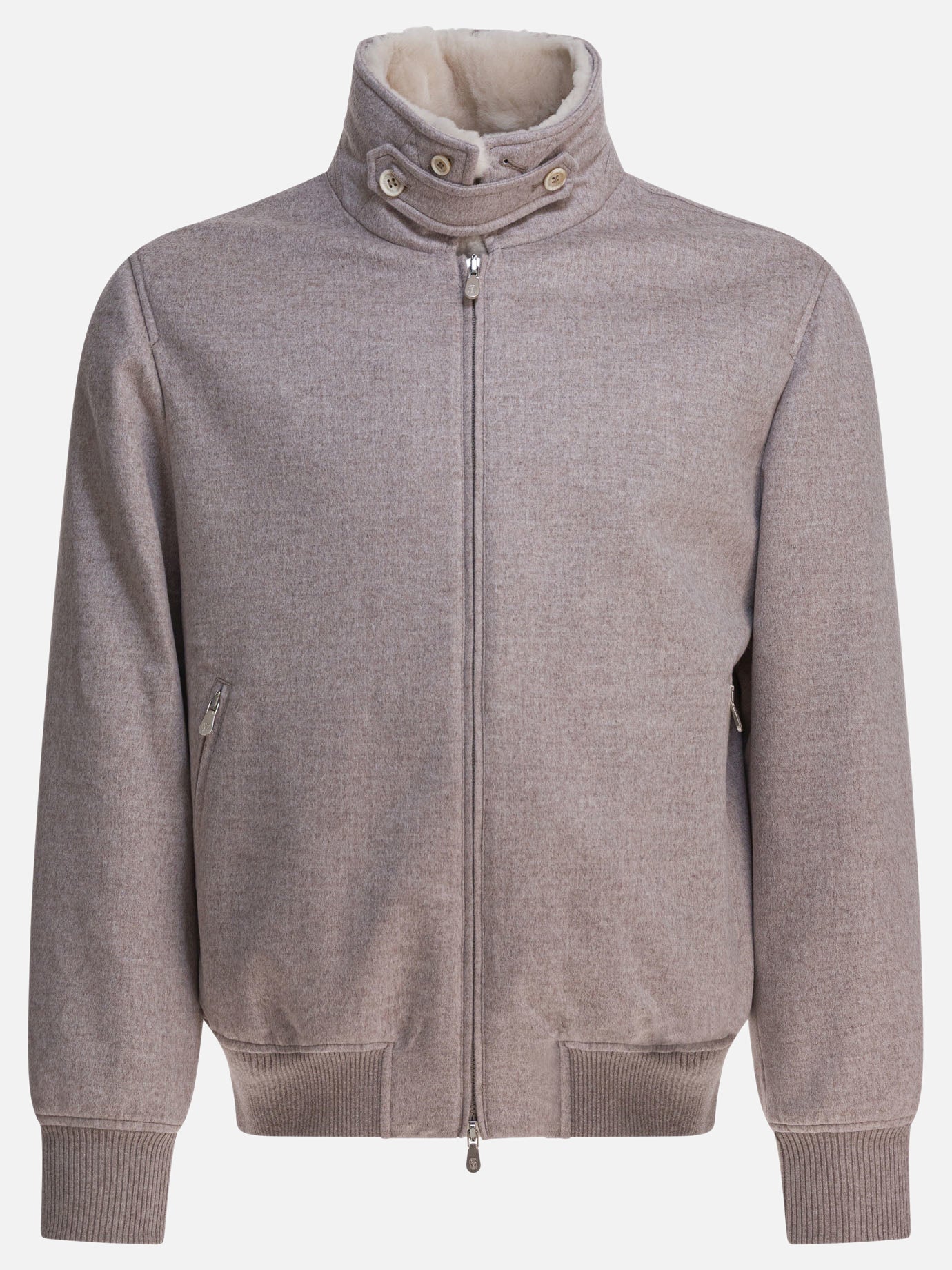 Brunello Cucinelli cashmere beave bomber jacket with membraned construction, made of cashmere beaver with brushed texture for a compact, soft surface. The construction features lightweight Thermore inner padding that balances weight and insulation. The model features an essential silhouette with a collar fitted with a detachable shearling insert, a double-slider front zipper closure and ribbed knit edging at the cuffs and hem.