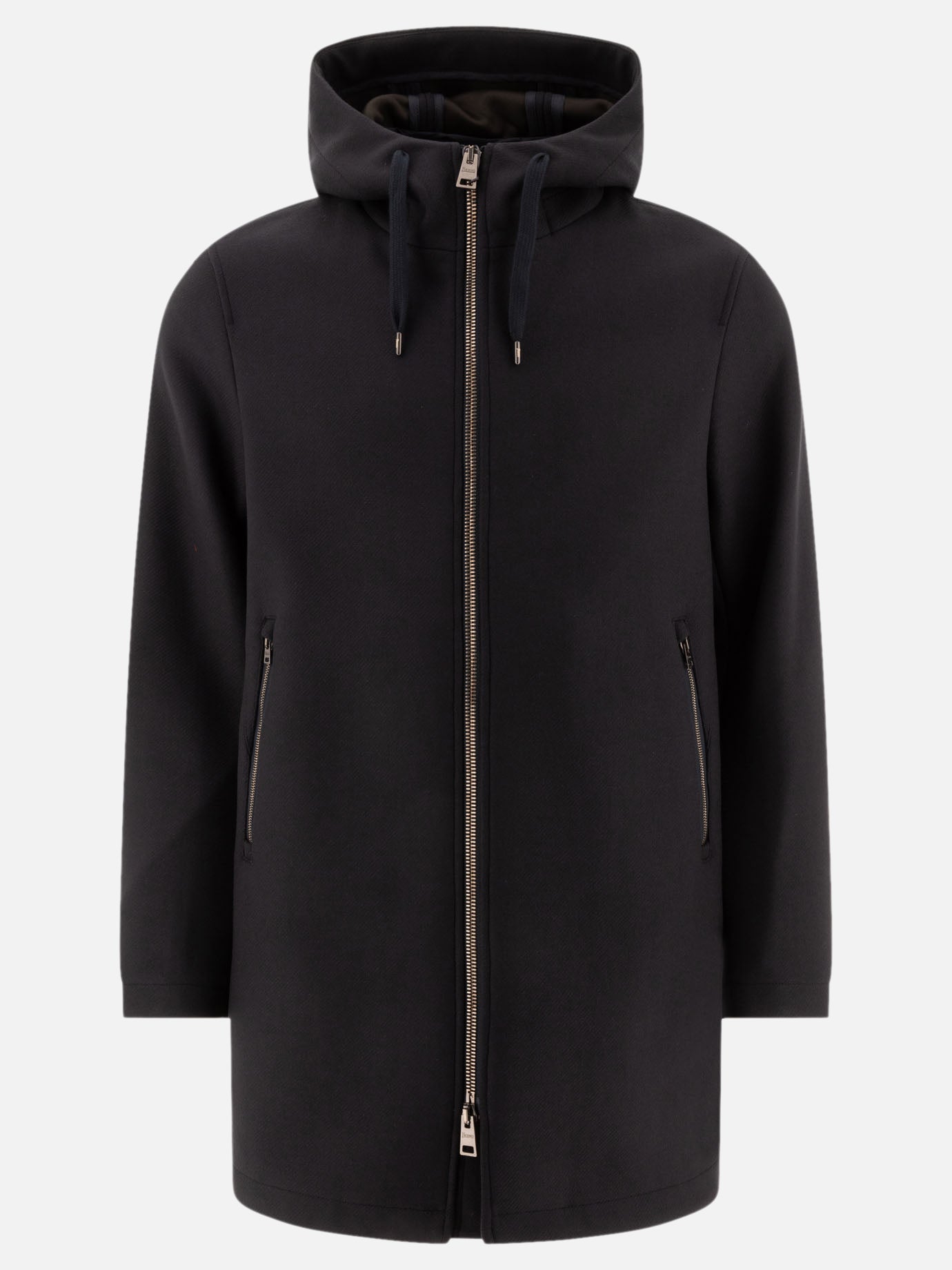 Herno's navy blue virgin wool blend hooded parka is a stylish and versatile outerwear perfect for the modern, sophisticated man. This garment combines comfort, style and functionality, proving ideal for facing the coldest days with class. The solid color and regular fit make it a timeless garment, suitable for multiple occasions.
