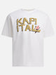 Kapital "Canoe Kapital" T-shirt features cotton construction, regular silhouette and ribbed crew neck. The front shows the KAP][TAL logo print, inspired by the leather labels on Kapital jeans. The print, composed of distinctive graphic characters, includes an outward-facing parenthesis and a stylized "L" to resemble a canoe, details that contribute to the garment's visual identity. Uniform surface finishing.