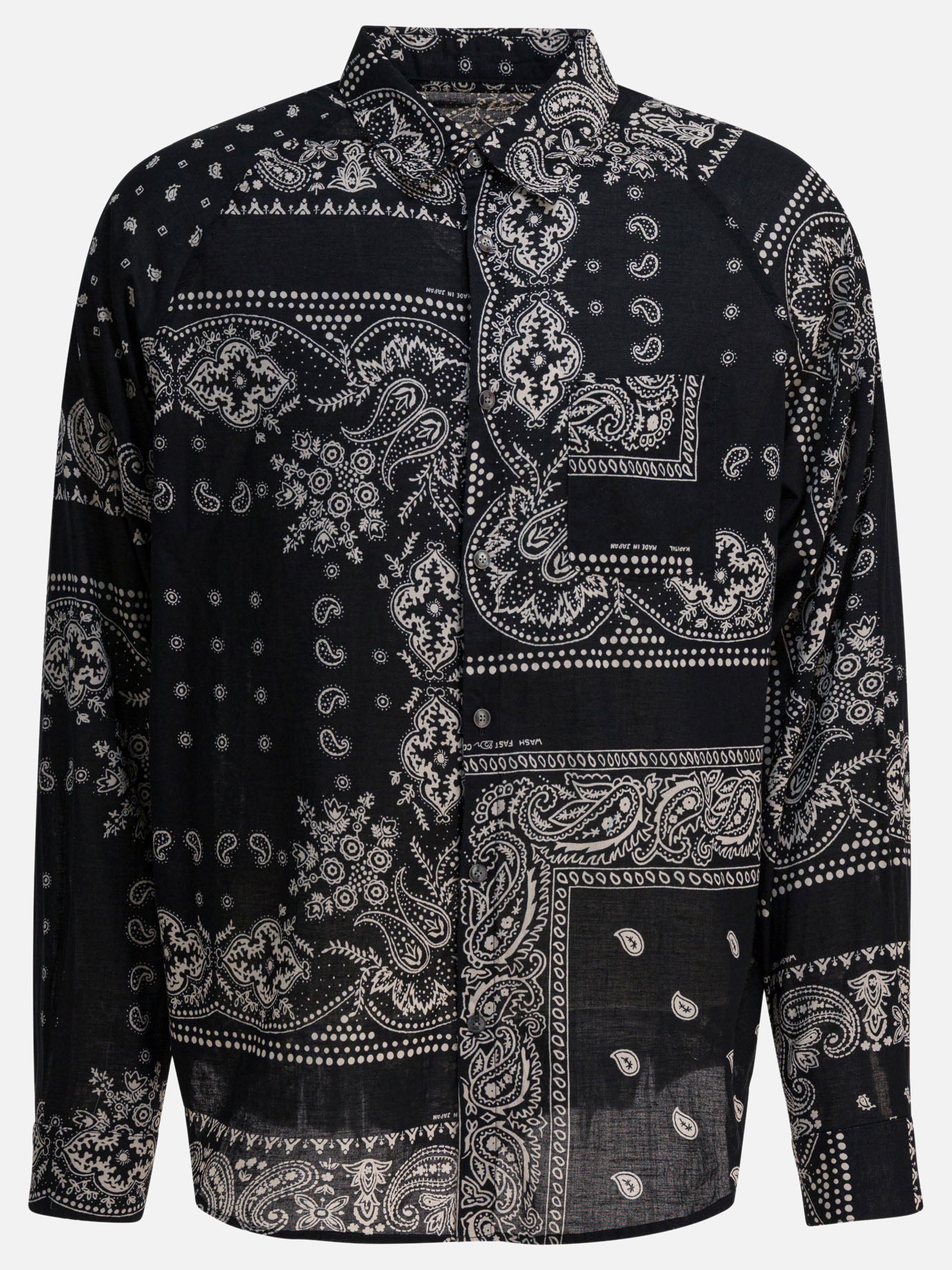 Kapital cotton shirt made of gauze fabric and featuring a patchwork paisley-patterned texture. The silhouette features a relaxed fit, raglan sleeves and a classic collar. Attached to the chest is a pocket with an exposed stitched edge. The seams appear regular and visible, and the fabric has a light and breathable texture. Front closure with tone-on-tone buttons.