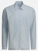 Prada striped zipper shirt made with a long-sleeved construction and classic collar. The construction features a front zipper closure and a patch pocket on the chest. Back yoke detail contributes to the definition of the straight silhouette. Fabric logo placed on front, main fabric unspecified. Clean finishes and regular seams emphasize the straightness of the garment.