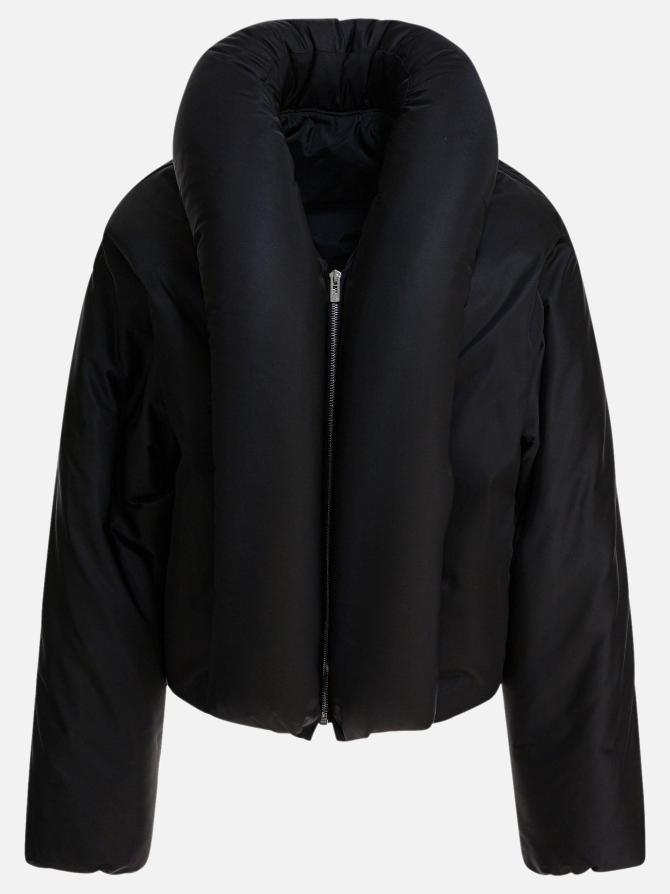 Alaïa padded bomber jacket made of taffeta with a compact structure. The construction features long sleeves and padded tubular lapels that outline the upper line. The silhouette features a rounded volume, with gathering at the waist and cuffs to define the structure of the garment. Padding provides constructive weight and supports the shape. The taffeta finish highlights the smooth, even surface of the fabric.