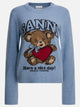 Ganni print wool sweater with a compact knit construction, made from a combination of wool, recycled wool and recycled polyamide. The construction features a round neckline, long sleeves and ribbed edges at the cuffs and hem. The regular silhouette follows a straight line and maintains a basic profile. Graphic elements on the front include a print and applique Ganni logo.
