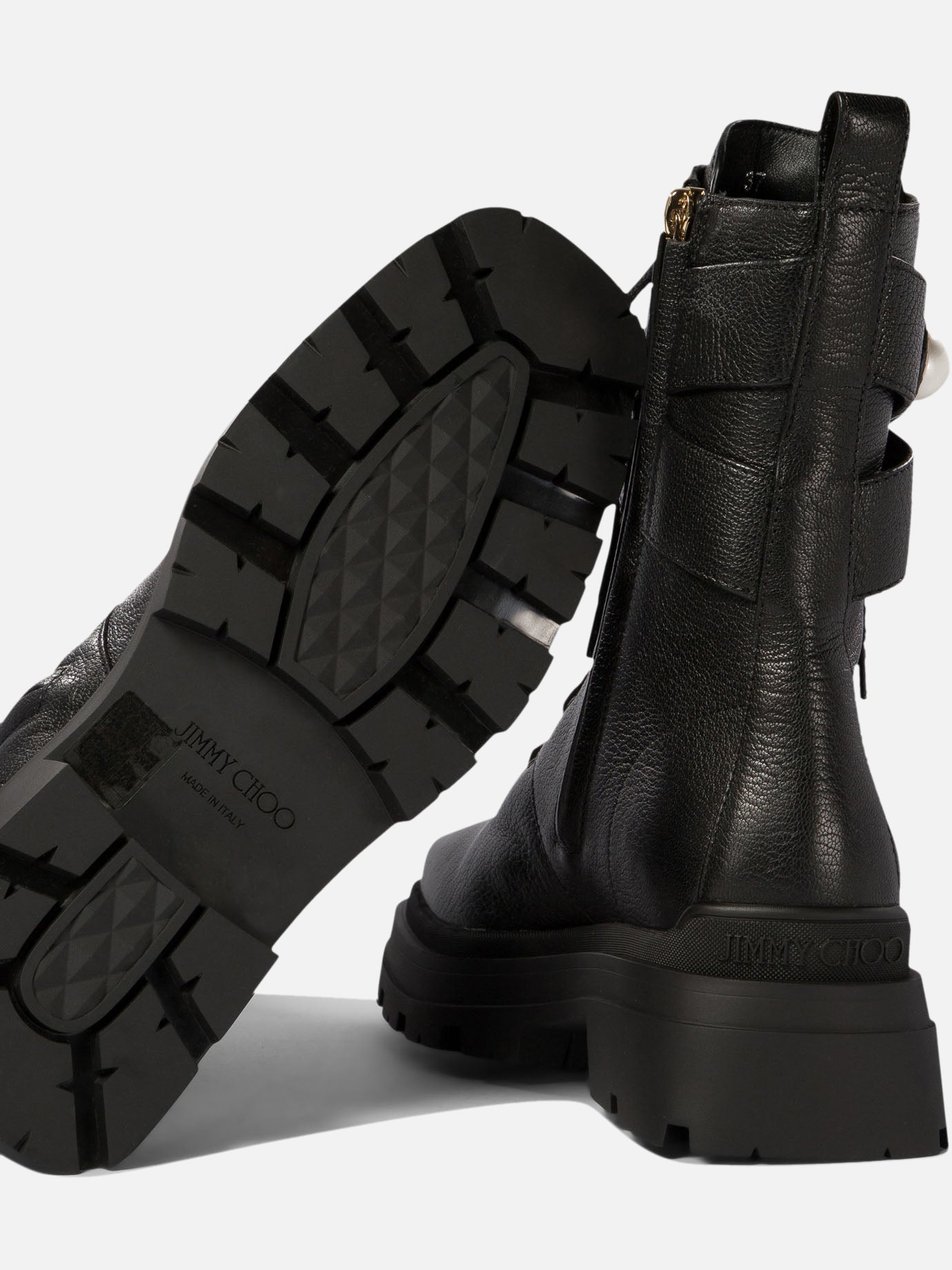 Jimmy Choo "Noemi 45" combat boots made of full-grain leather. The construction includes a structured upper with a lace-up closure and an inner lining, also made of leather. The silhouette features a squared toe and a strap placed on the ankle, decorated with pearl appliqués. The rubber sole with platform is designed to ensure solidity in walking and completes the essential aesthetic of the model.