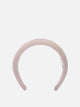 Miu Miu velvet headband, semi-rigid construction with velvet lining and application of luminous elements on the surface. Gold lettering logo finished in relief is located on one side, integrated into the structure. The rounded silhouette offers a thick and defined silhouette, maintained by a stable inner core. Set crystals create reflections and visible details along the upper arch.