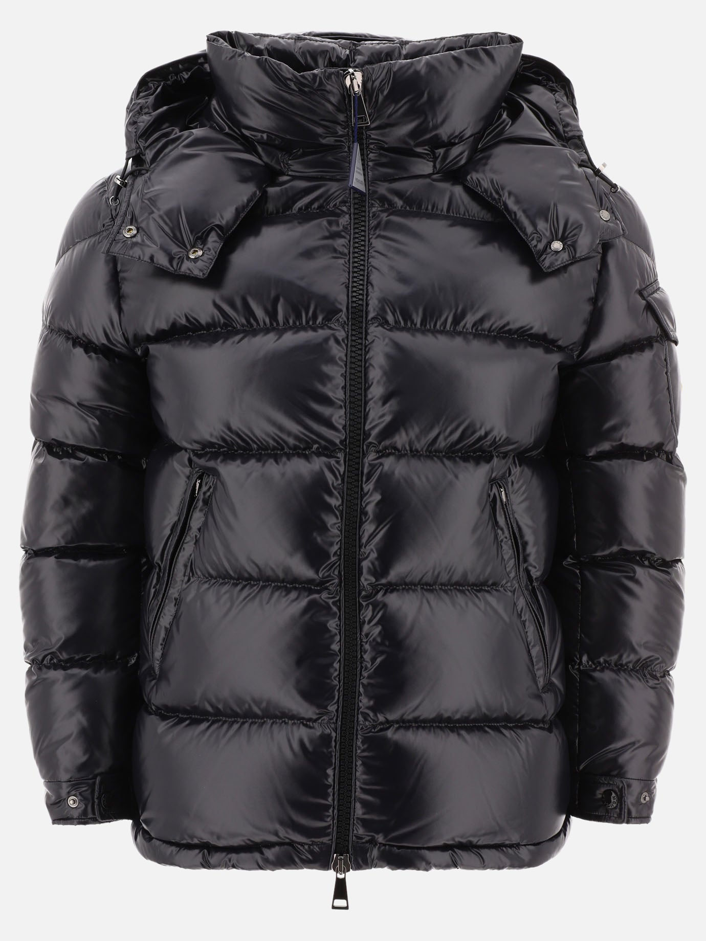 Moncler "Maire" Down Jacket. Short model with down and feather inner filling, made of shiny laqué nylon with matching inner lining. The structure features a wide silhouette and straight lines, the hood is removable via a concealed zipper, and the front closure is integral with a metal zipper. The side pockets are zipped and the cuffs are adjustable with snap buttons.